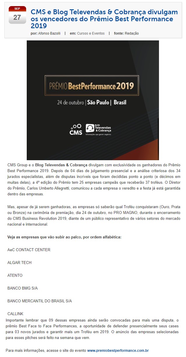 ONLINE - CMS e Blog Televendas & Cobrança divulgam os vencedores do Prêmio Best Performance 2019 (27/09)