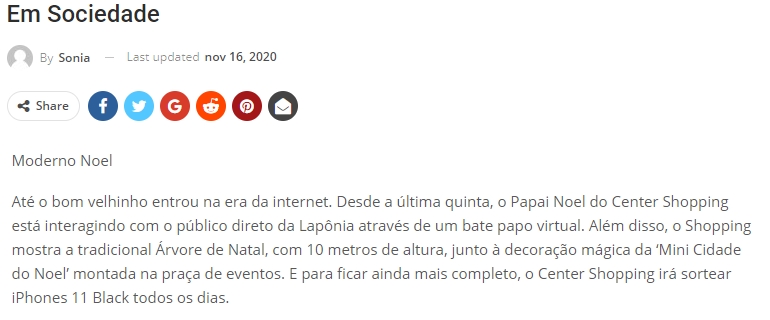 ONLINE - Coluna Em Sociedade - Natal do Center Shopping terá Papai Noel interagindo com clientes direto da Lapônia - 16/11