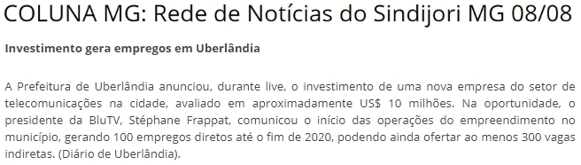 ONLINE - COLUNA MG: Investimento gera empregos em Uberlāndia - 08/08