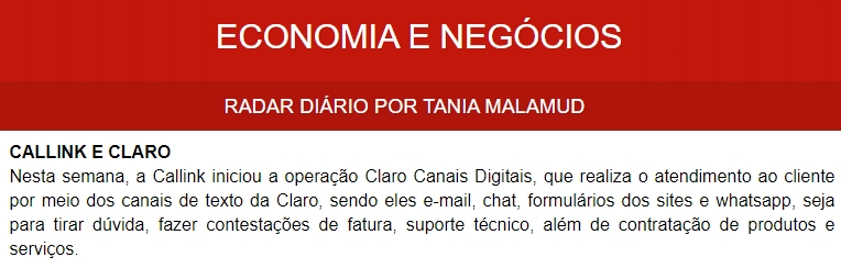 ONLINE - Coluna Radar Diário - Callink e Claro - 30/10