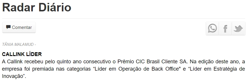 ONLINE - Coluna Radar Diário - Callink Líder - 02/10