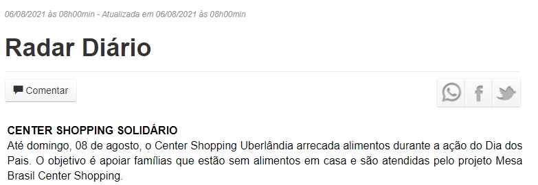 ONLINE - Coluna Radar Diário - Nota sobre arrecadação de alimentos no Dia dos Pais - 06.08