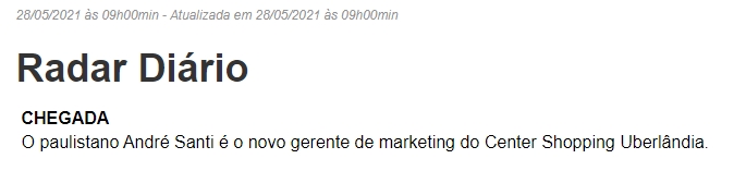 ONLINE - Coluna Radar Diário - Nota sobre o novo gerente de marketing do Center Shopping - 28.05
