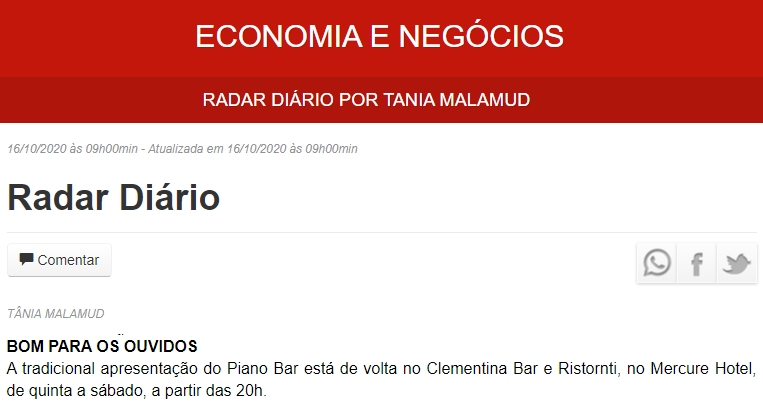 ONLINE - Coluna Radar Diário - Volta do Piano Bar - 16/10
