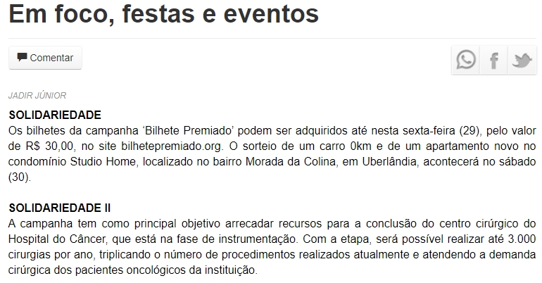 ONLINE - Coluna Social - 'Bilhete Premiado' do Hospital do Câncer em Uberlândia pode ser adquirido até nesta sexta-feira - 28/01
