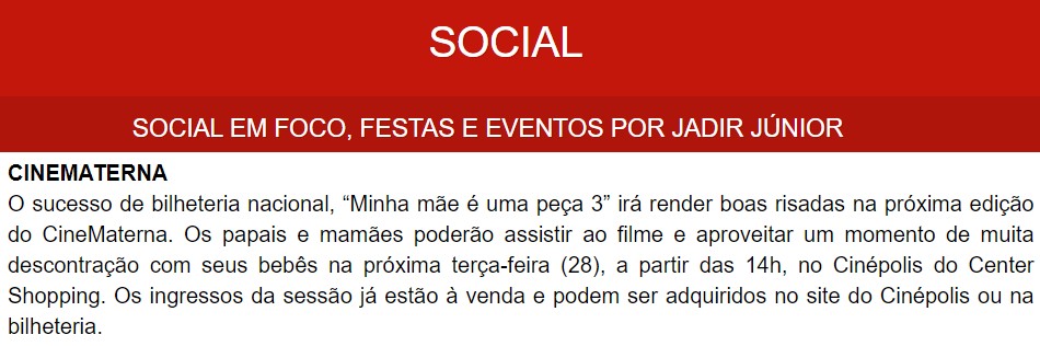 ONLINE - COLUNA SOCIAL - EM FOCO, FESTAS E EVENTOS - CINEMATERNA - 25/01