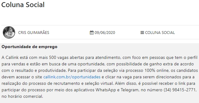 ONLINE - COLUNA SOCIAL - Oportunidade de emprego - 09/06