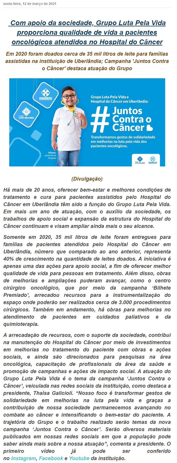 ONLINE - Com apoio da sociedade, Grupo Luta Pela Vida proporciona qualidade de vida a pacientes oncológicos atendidos no Hospital do Câncer - 12.03