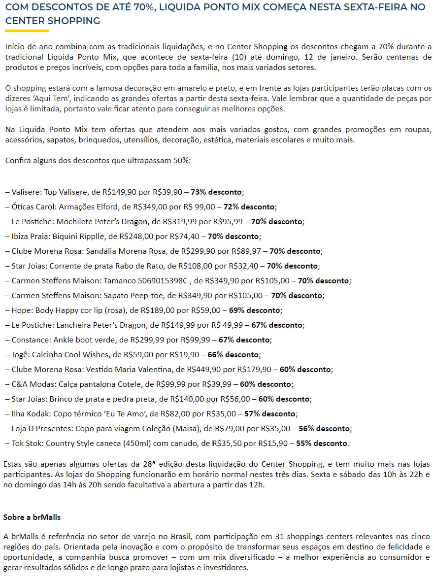 ONLINE - Com descontos de até 70%, Liquida Ponto Mix começa nesta sexta-feira no Center Shopping - 06/01