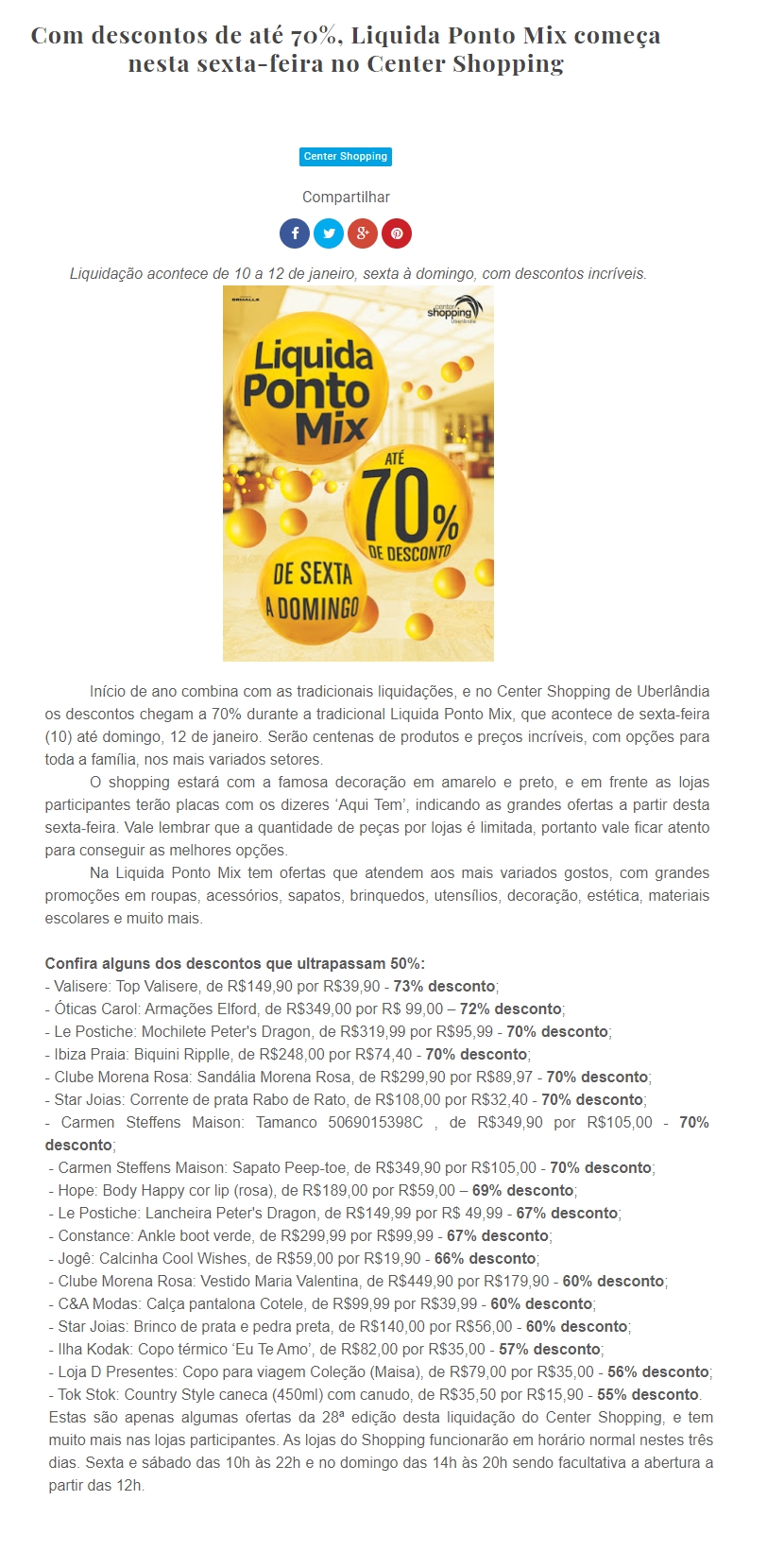 ONLINE - Com descontos de até 70%, Liquida Ponto Mix começa nesta sexta-feira no Center Shopping - (07/01)