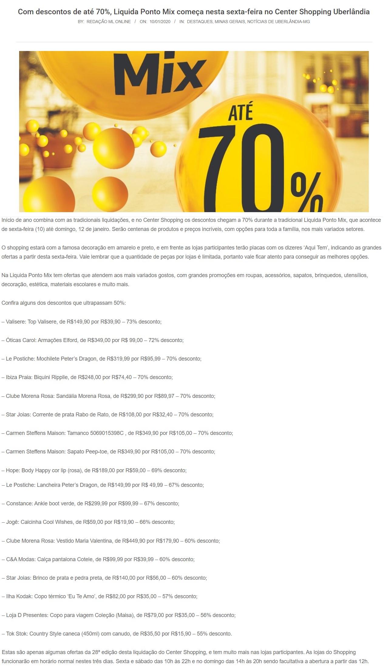 ONLINE - Com descontos de até 70%, Liquida Ponto Mix começa nesta sexta-feira no Center Shopping - 10/01