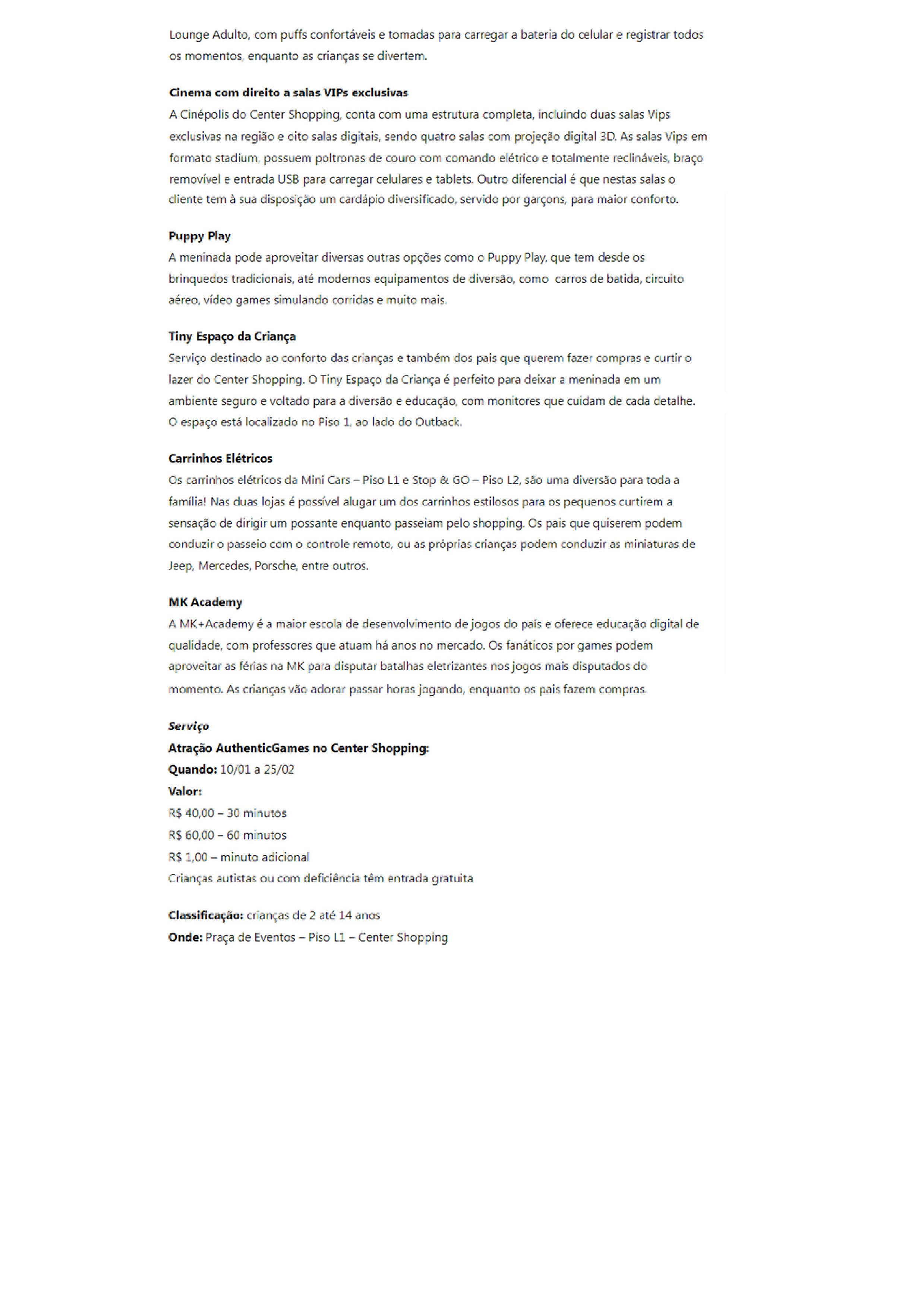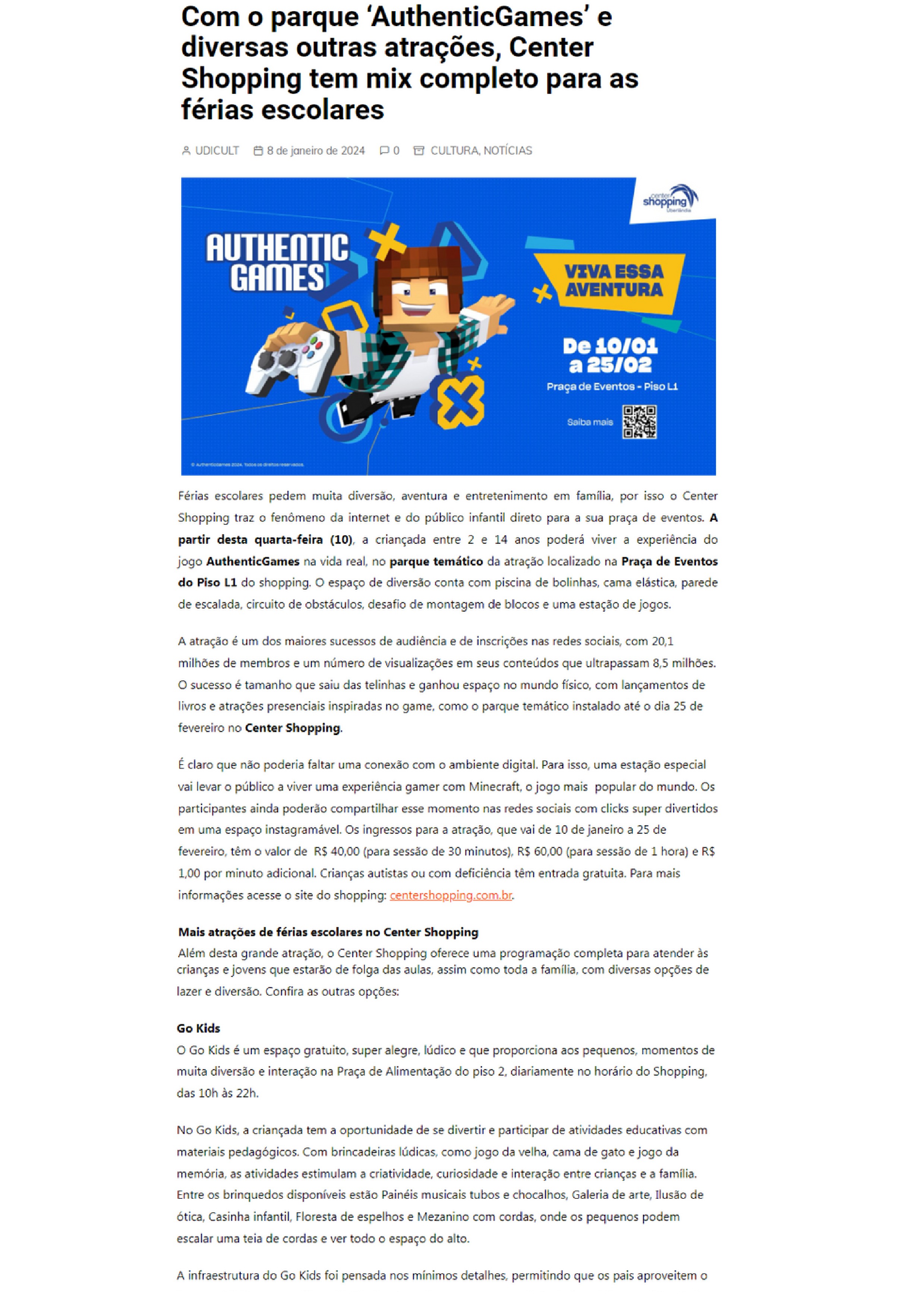 ONLINE-Com o parque 'AuthenticGames' e diversas outras atrações, Center Shopping tem mix completo para as férias escolares-08.01