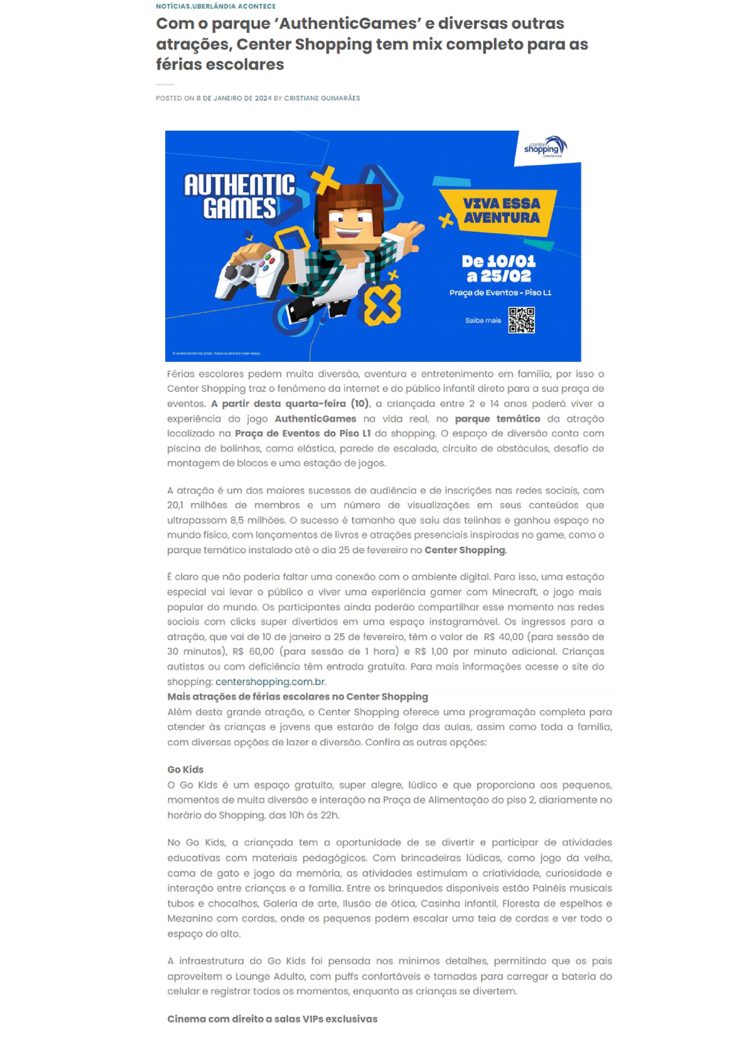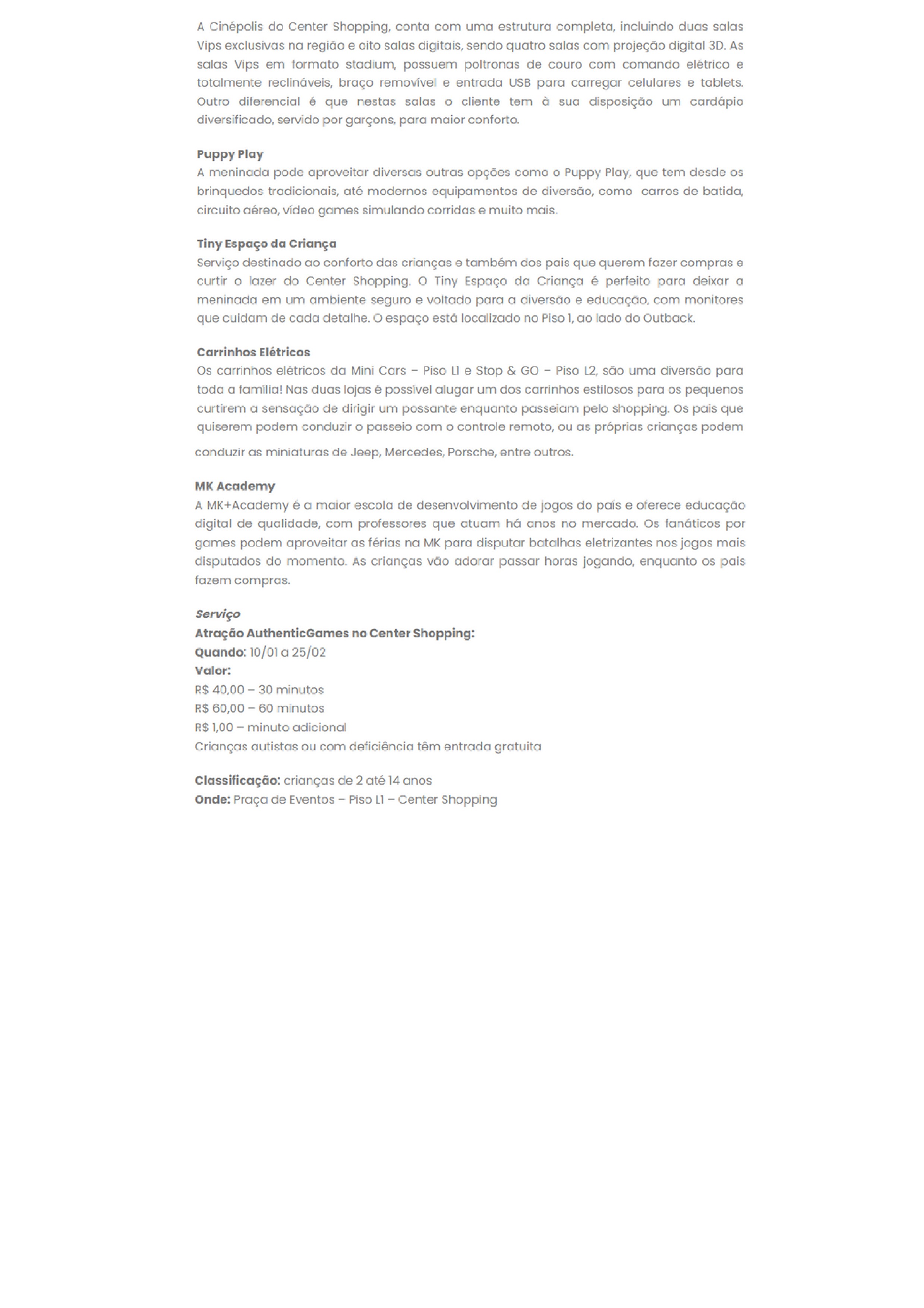 ONLINE - Com o parque 'AuthenticGames' e diversas outras atrações, Center Shopping tem mix completo para as férias escolares- 08.01