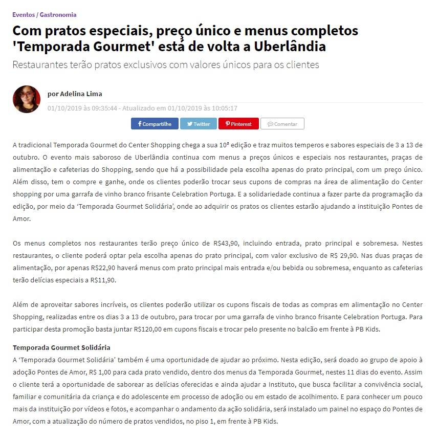 ONLINE - Com pratos especiais, preço único e menus completos 'Temporada Gourmet' está de volta - Center Shopping - (01/10)