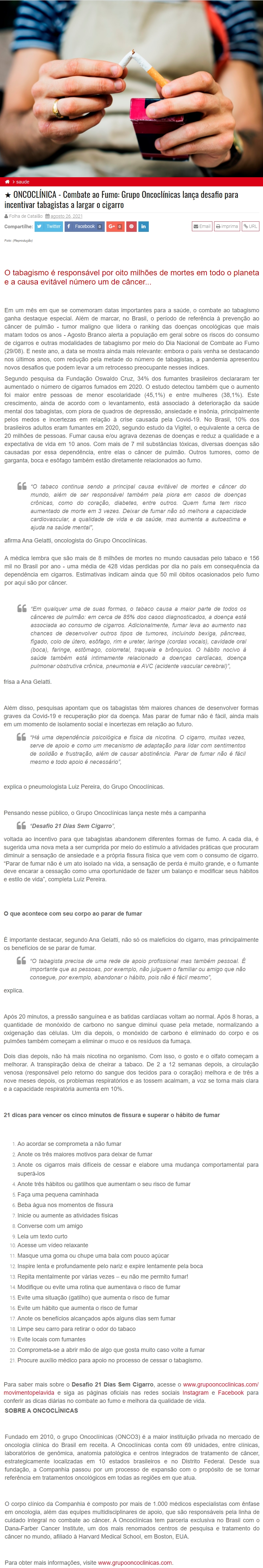 ONLINE-Combate ao Fumo: Grupo Oncoclínicas lança desafio para incentivar tabagistas a largar o cigarro-26.08