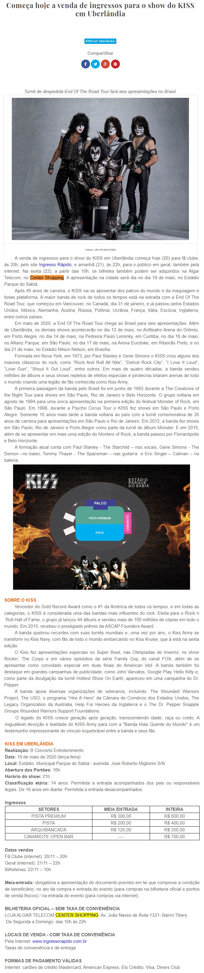 ONLINE - Começa hoje a venda de ingressos para o show do KISS em Uberlândia - PONTO DE VENDAS (20/11)