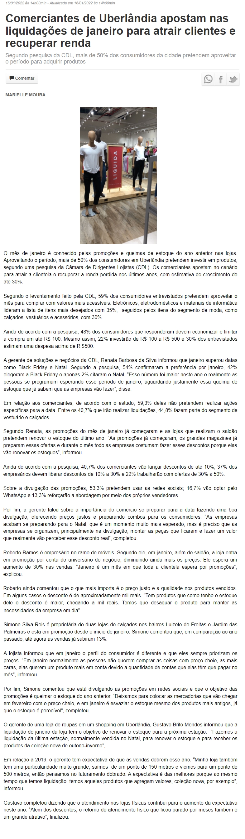ONLINE - Comerciantes de Uberlândia apostam nas liquidações de janeiro para atrair clientes e recuperar renda - 16.01