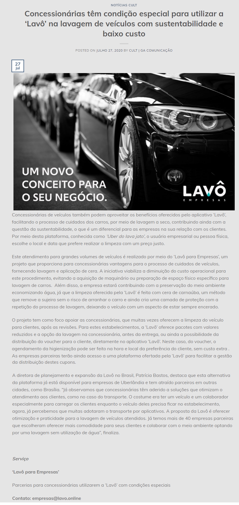 ONLINE - Concessionárias têm condição especial para utilizar a 'Lavô' na lavagem de veículos com sustentabilidade e baixo custo - (27/07)