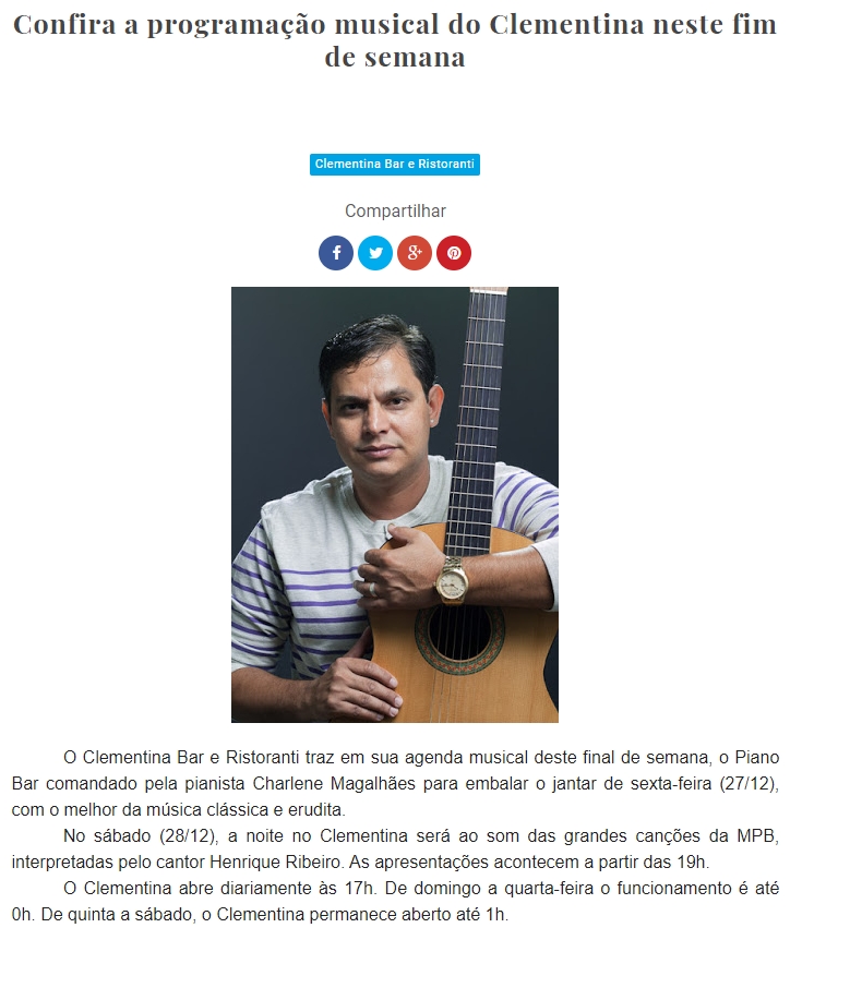 ONLINE -Confira a programação musical do Clementina neste fim de semana - (26/12)
