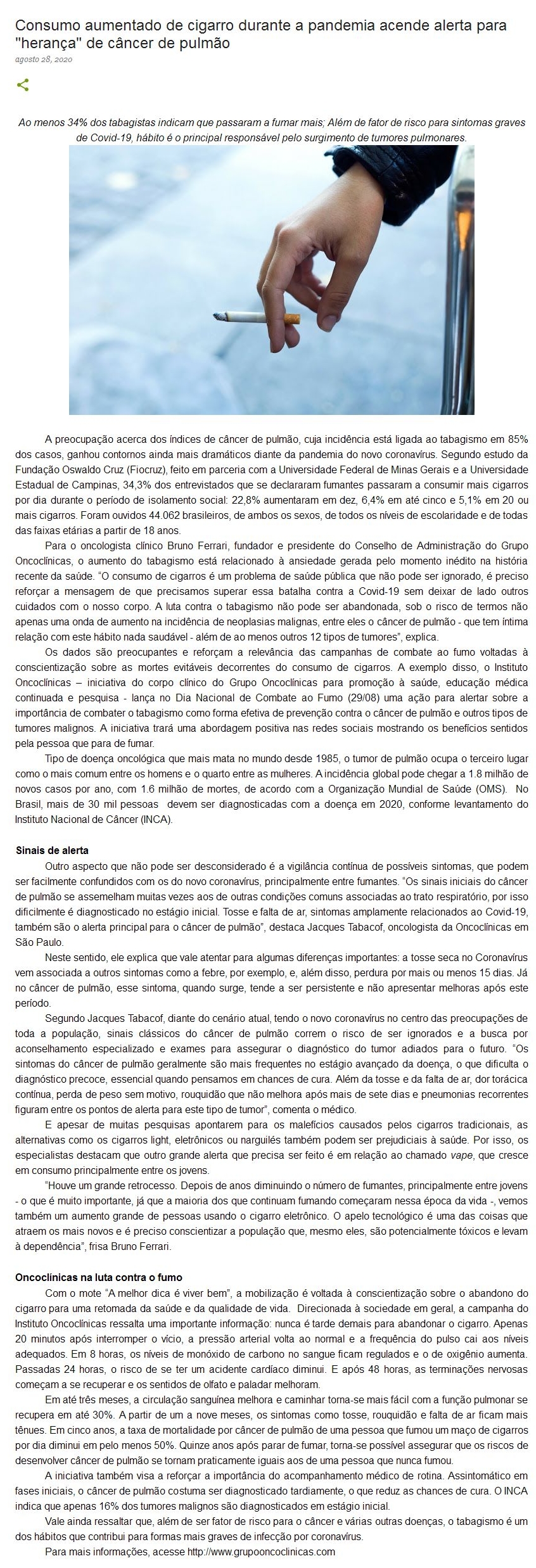 ONLINE - Consumo aumentado de cigarro durante a pandemia acende alerta para "herança" de câncer de pulmão - 01/09