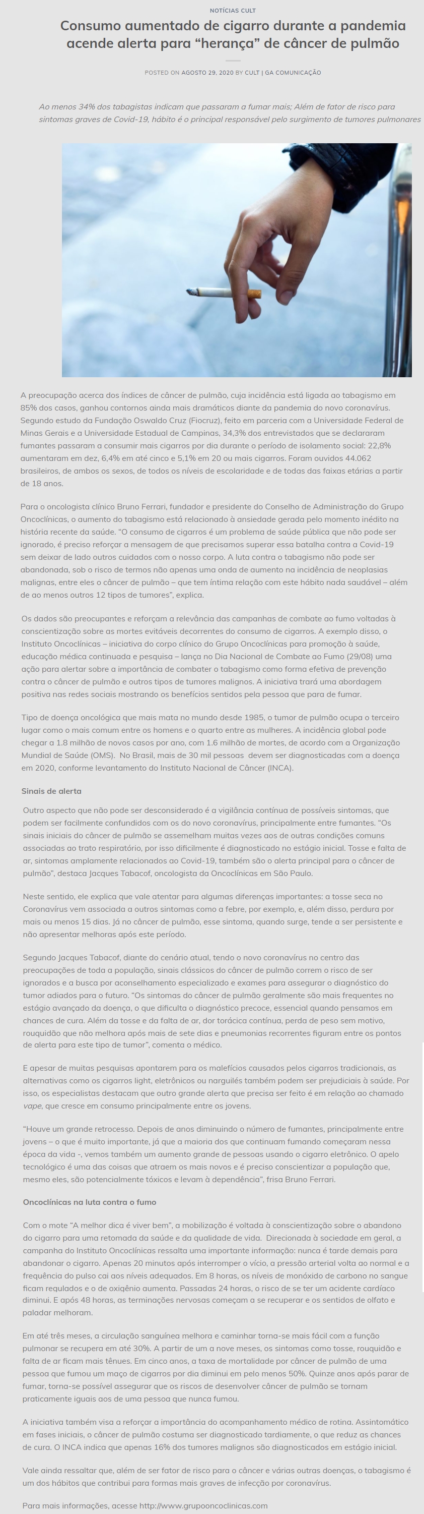 ONLINE- Consumo aumentado de cigarro durante a pandemia acende alerta para "herança" de câncer de pulmão - 29/08