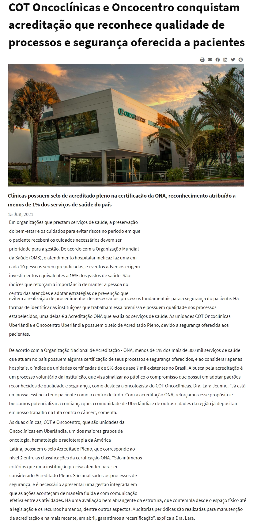 ONLINE - COT Oncoclínicas e Oncocentro conquistam acreditação que reconhece qualidade de processos e segurança oferecida a pacientes - 15.06