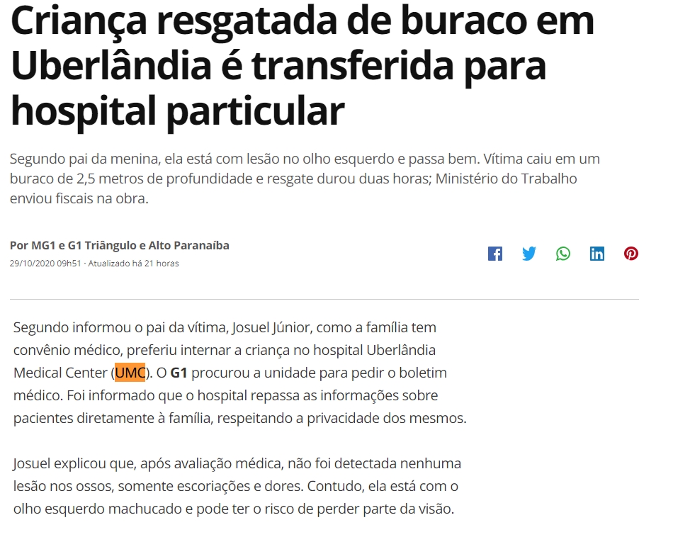 ONLINE - Criança resgatada de buraco em Uberlândia é transferida para hospital particular - Menção ao UMC - 29/10