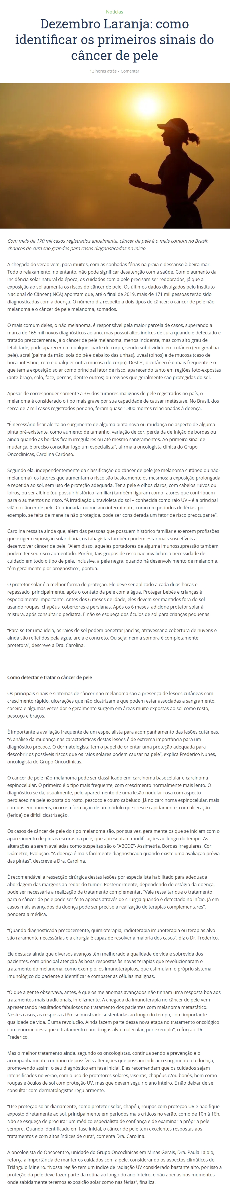 ONLINE -Dezembro Laranja: como identificar os primeiros sinais do cāncer de pele - (19/12)