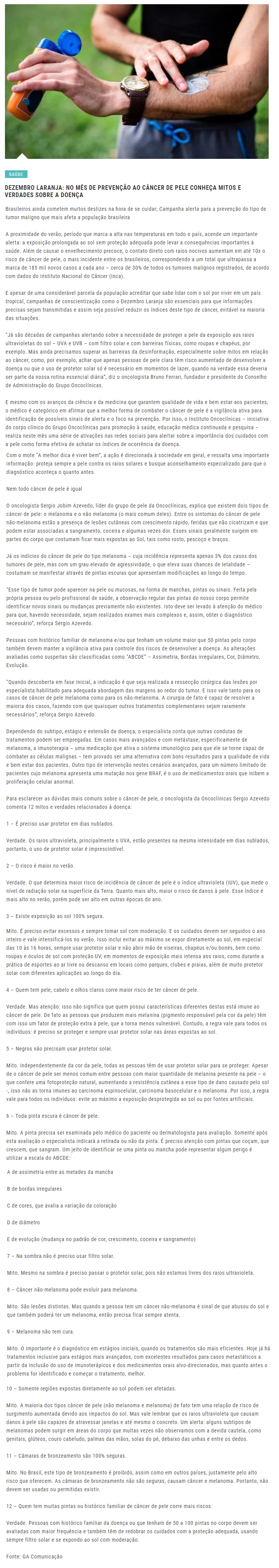 ONLINE - Dezembro Laranja: No mês de prevenção ao câncer de pele conheça mitos e verdades sobre a doença - 10/12