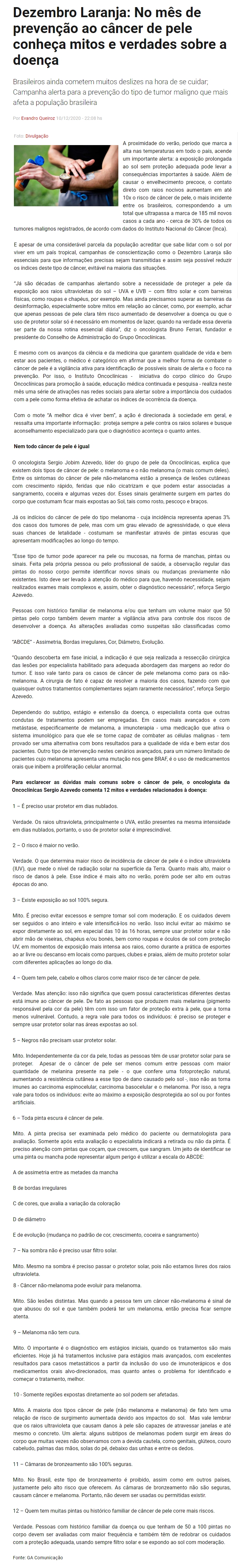 ONLINE - Dezembro Laranja: No mês de prevenção ao câncer de pele conheça mitos e verdades sobre a doença - 10/12