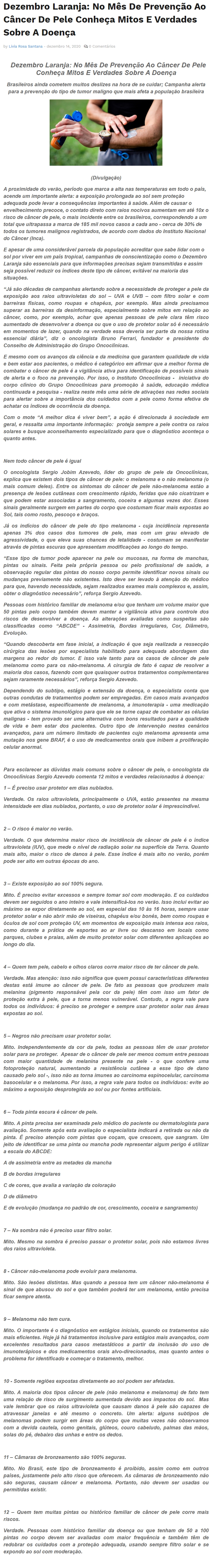 ONLINE- Dezembro Laranja: No mês de prevenção ao câncer de pele conheça mitos e verdades sobre a doença - 14/12