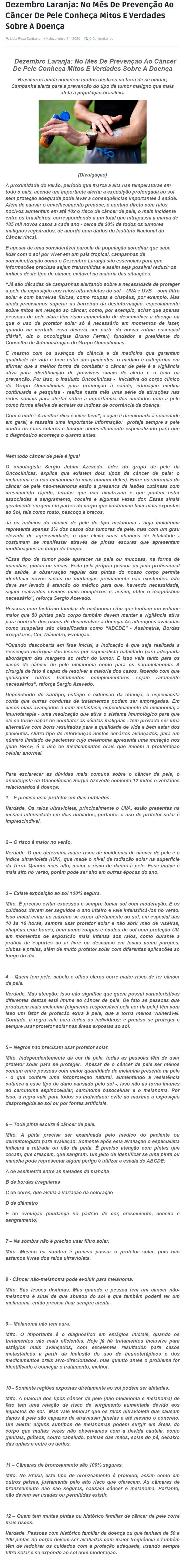 ONLINE - Dezembro Laranja: No mês de prevenção ao câncer de pele conheça mitos e verdades sobre a doença - 14/12