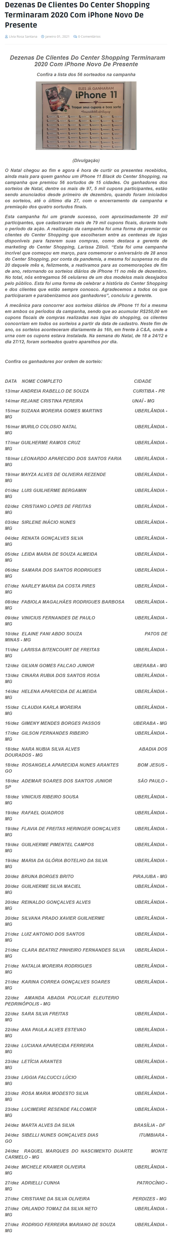 ONLINE - Dezenas de clientes do Center Shopping terminam 2020 com iPhone novo de presente - 01/01