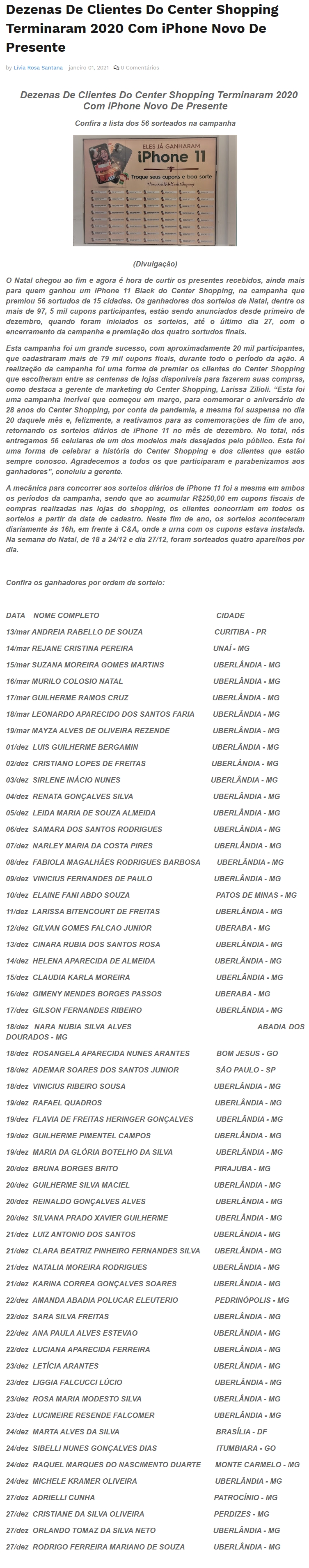 ONLINE - Dezenas de clientes do Center Shopping terminam 2020 com iPhone novo de presente 01/01