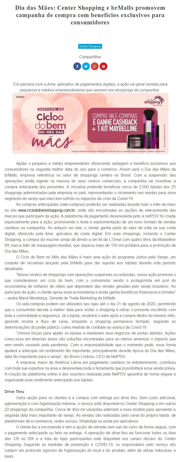 ONLINE - Dia das Mães: Center Shopping e brMalls promovem campanha de compra com benefícios exclusivos para consumidores - 06/05