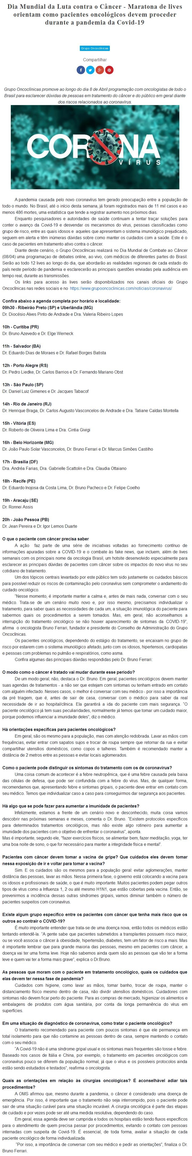 ONLINE - Dia Mundial da Luta contra o Câncer - Maratona de lives orientam como pacientes oncológicos devem proceder durante a pandemia da Covid-19 - 0