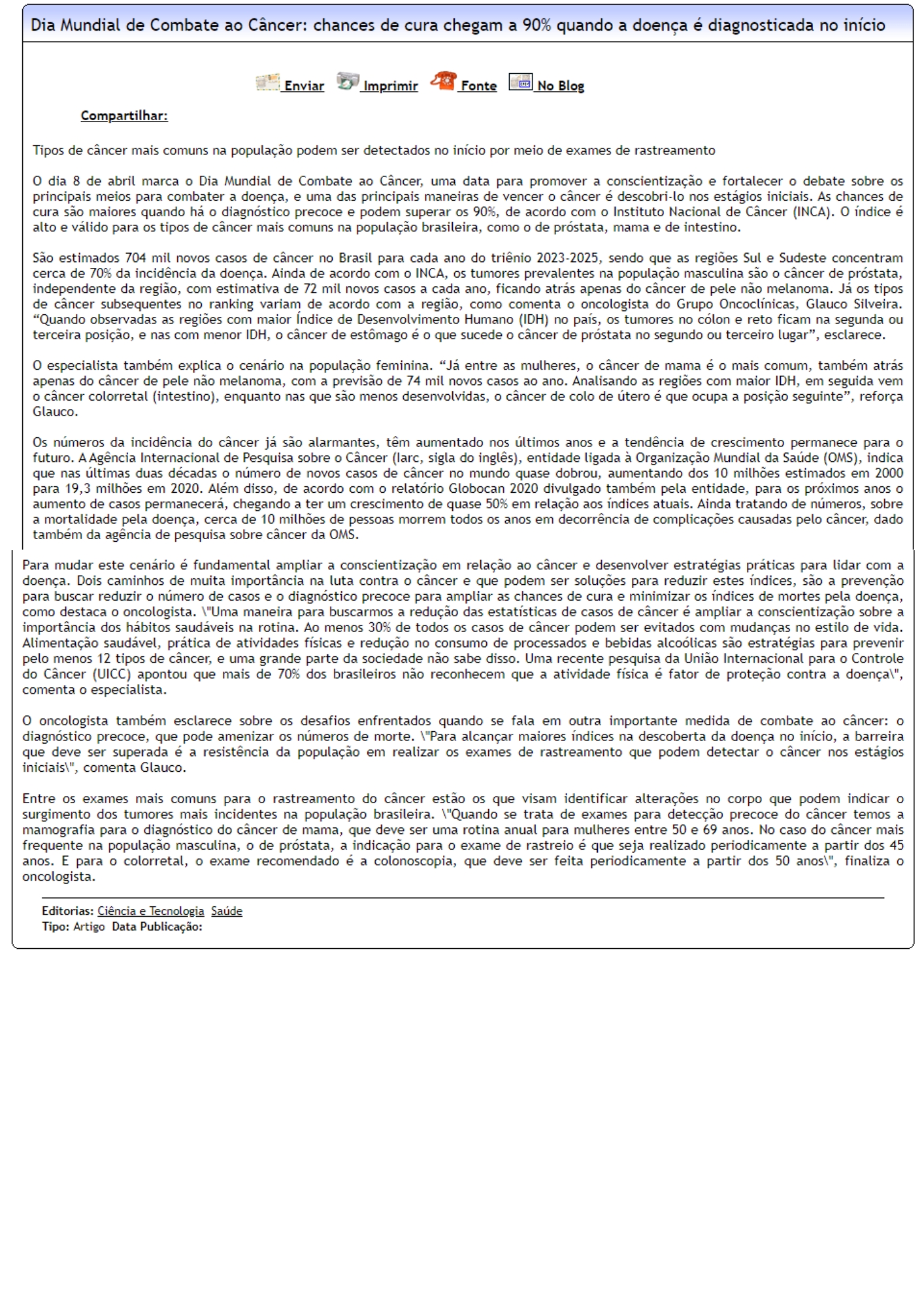 ONLINE - Dia Mundial de Combate ao Câncer: chances de cura chegam a 90% quando a doença é diagnosticada no início - 11.04