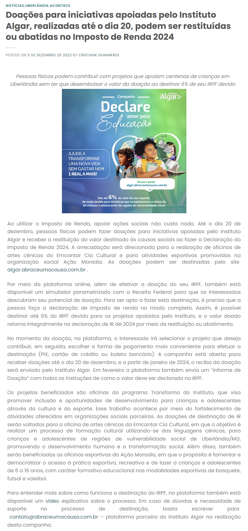 ONLINE - Doações para iniciativas apoiadas pelo Instituto Algar, realizadas até o dia 20, podem ser restituídas ou abatidas no Imposto de Renda -05.12