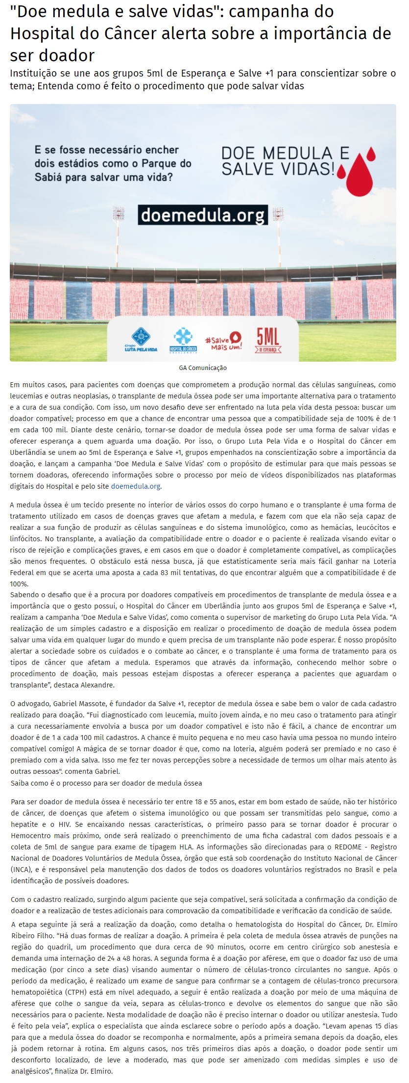 ONLINE - "Doe medula e salve vidas": campanha do Hospital do Câncer alerta sobre a importância de ser doador - 10.06