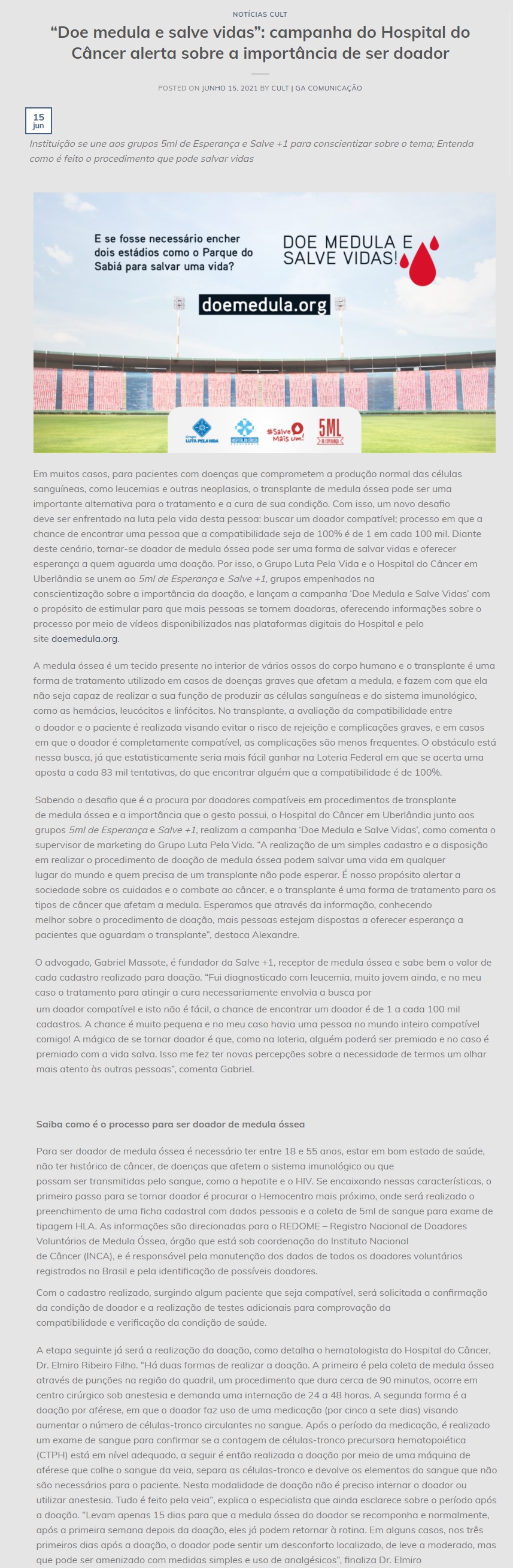 ONLINE - "Doe medula e salve vidas": campanha do Hospital do Cāncer alerta sobre a importāncia de ser doador - 15.06