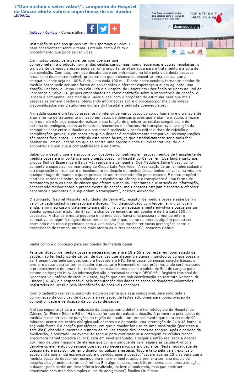 ONLINE - "Doe medula e salve vidas": campanha do Hospital do Cāncer alerta sobre a importāncia de ser doador - 18.06