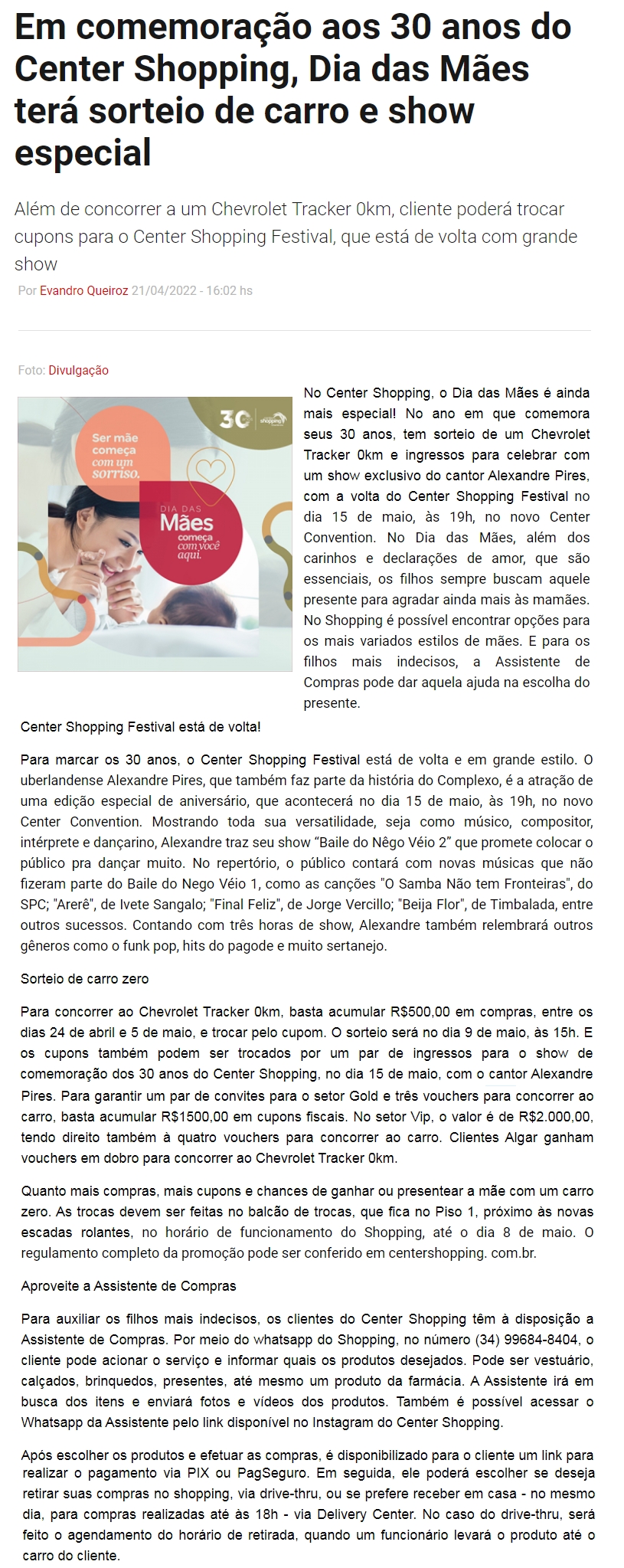 ONLINE-Em comemoração aos 30 anos do Center Shopping, Dia das Mães terá sorteio de carro e show especial-21.04