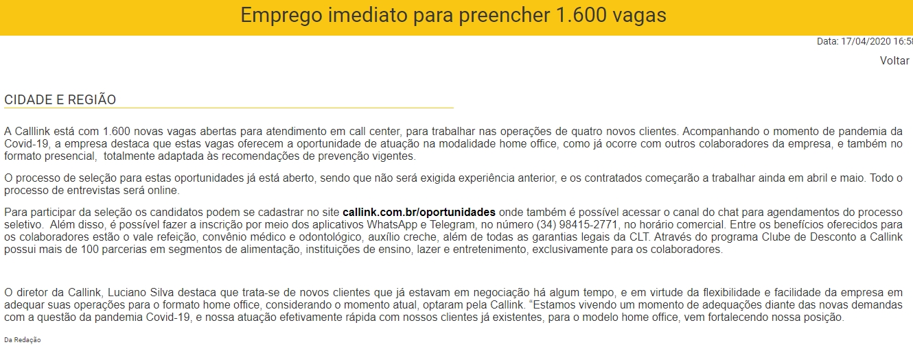 ONLINE - Emprego imediato para preencher 1.600 vagas - 17/04