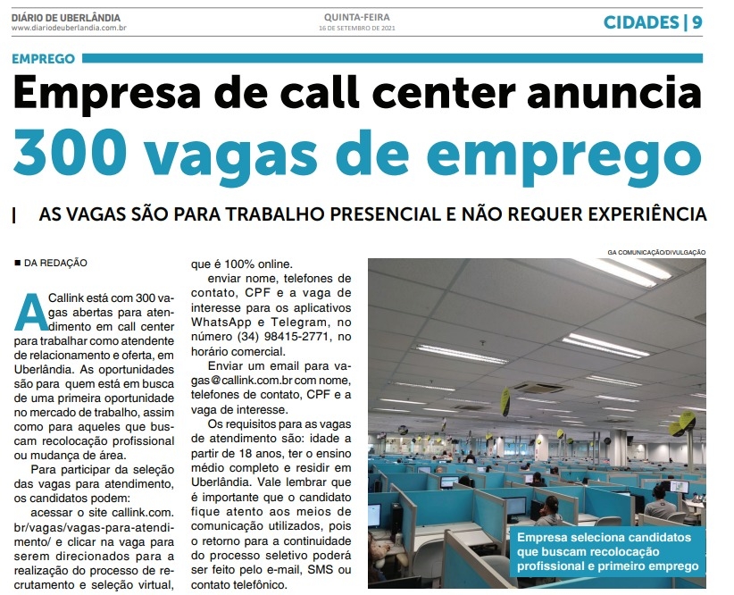 ONLINE- Empresa de call center anuncia 300 vagas de emprego - 16.09