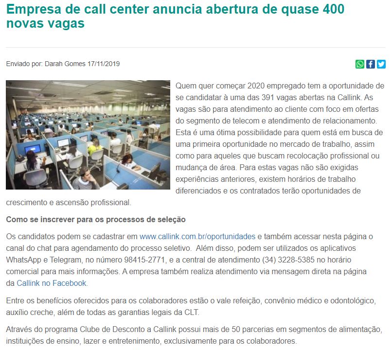 ONLINE - Empresa de call center anuncia abertura de quase 400 novas vagas (17/11)