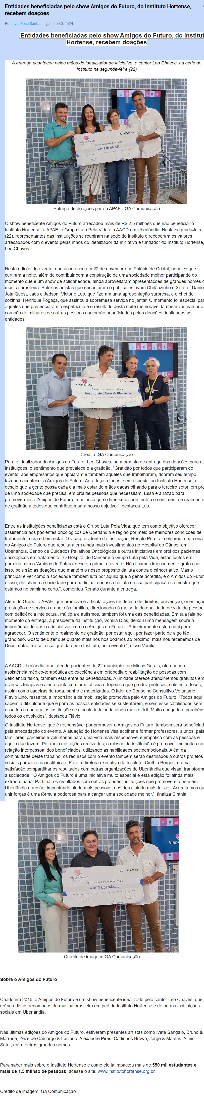 ONLINE-Entidades beneficiadas pelo show Amigos do Futuro, do Instituto Hortense, recebem doações-30.01
