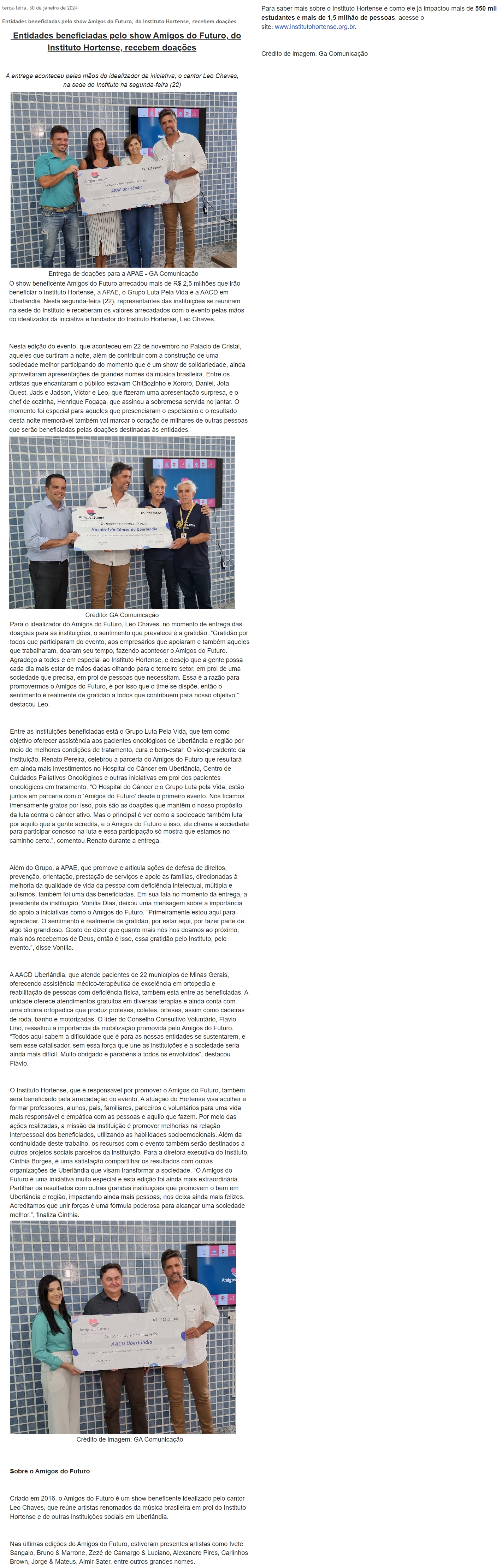 ONLINE - Entidades beneficiadas pelo show Amigos do Futuro, do Instituto Hortense, recebem doações - 30.01