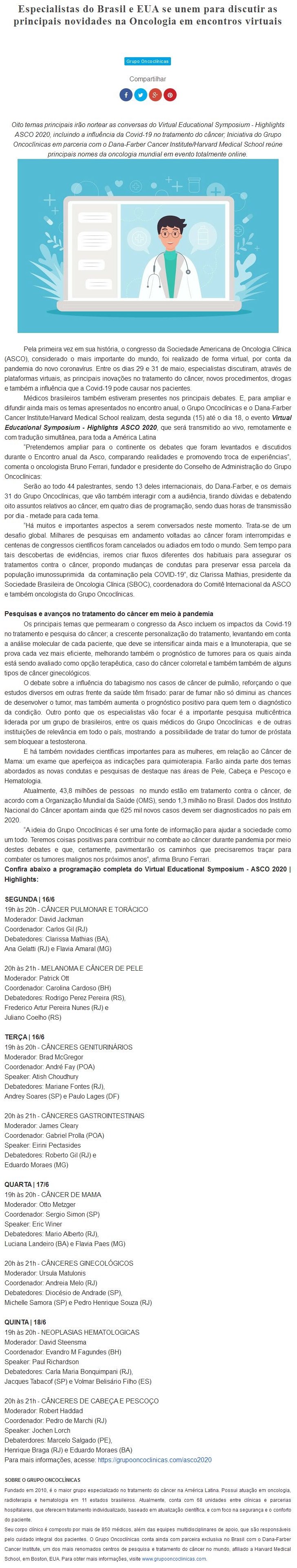 ONLINE - Especialistas do Brasil e EUA se unem para discutir as principais novidades na Oncologia em encontros virtuais - 16/06/2020