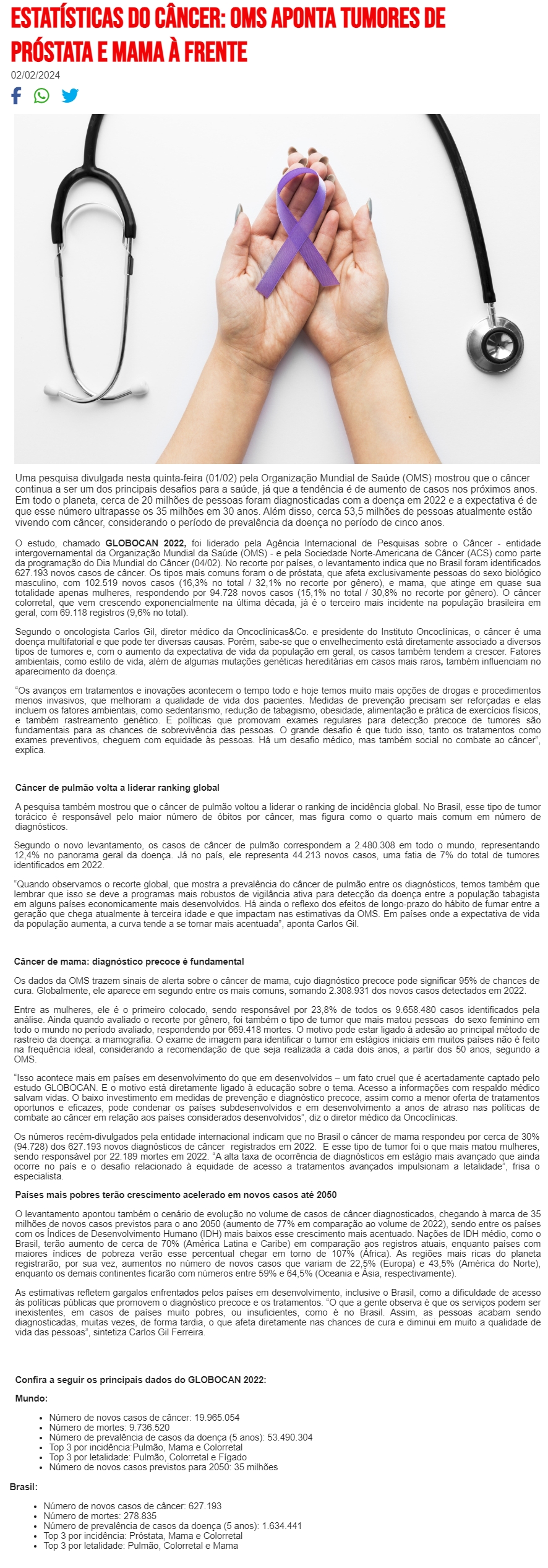 ONLINE-Estatísticas do Câncer: No Brasil, tumores de Próstata e Mama à frente, revela análise global da OMS-02.02