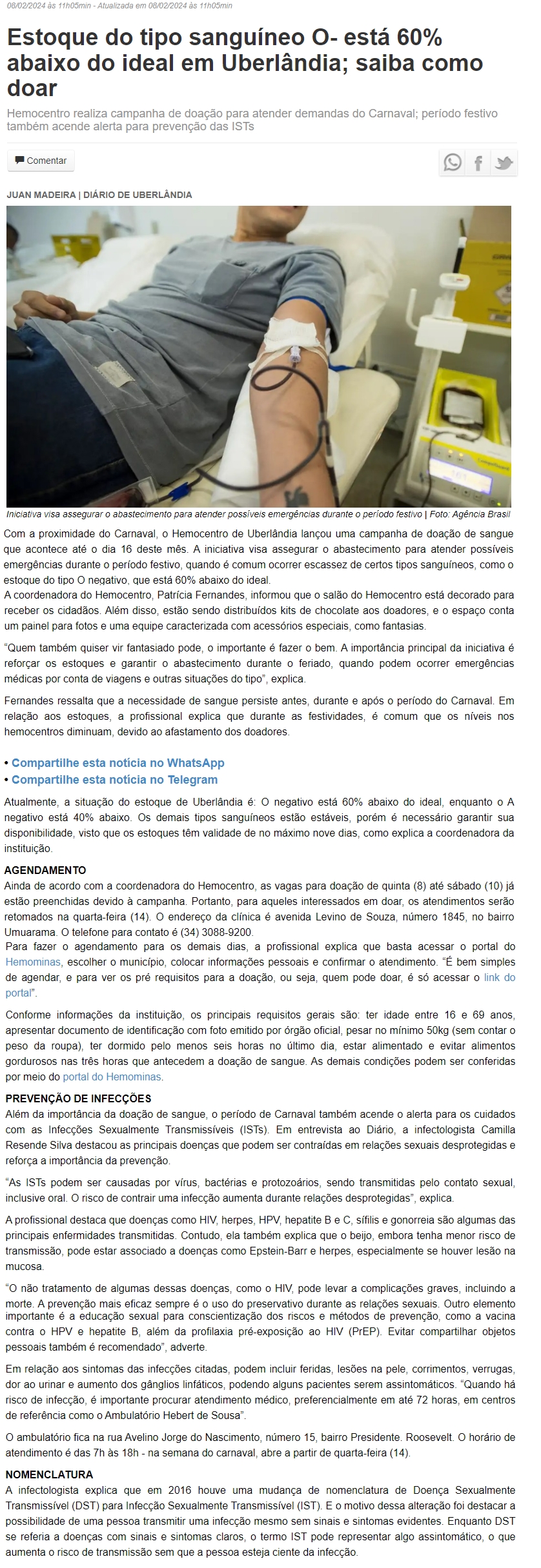 ONLINE-Estoque do tipo sanguíneo O- está 60% abaixo do ideal em Uberlândia; saiba como doar-08.02